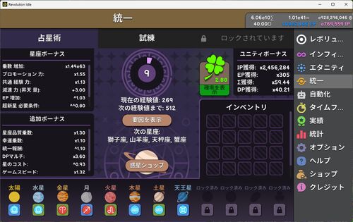 Revolution Idle 正式版 store.steampowered.com 難しい試練1を突破 ダイレーション中にe2e10に到達する実績を獲得 これでアセンション上げ待ちの時間がなくなるのかな 運4.00でレジェンダリー獲得 効果3つになるんだな 分単位でユニティできるようになって…
