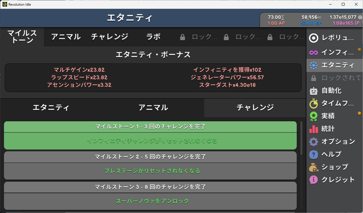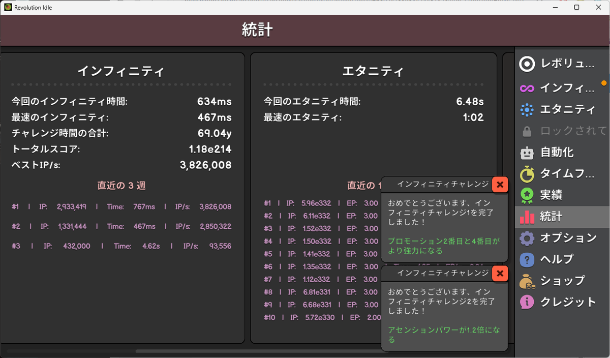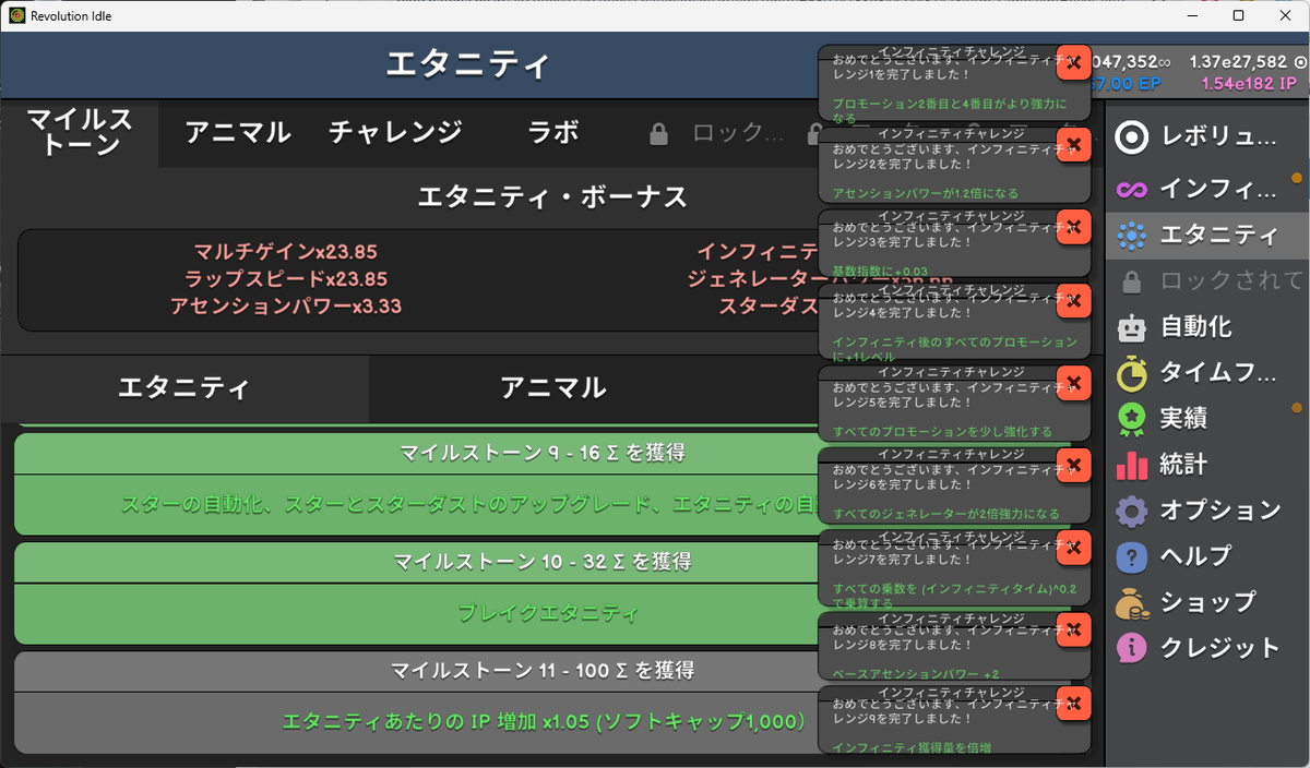 そしてエタニティチャレンジのマイルストーンを達成してインフィニティチャレンジがリセットされなくなったので、頑張って作ったインフィニティチャレンジ自動クリアは不要に